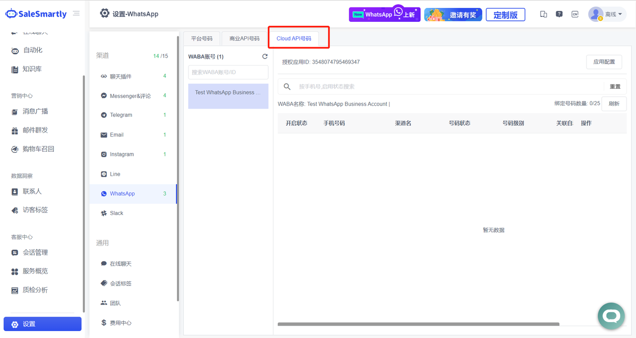 Trong Cài đặt - WhatsApp, một tab "Số Cloud API" đã được thêm vào. Người dùng có thể thêm số WS thông qua kênh này và sử dụng chúng để bắt đầu cuộc trò chuyện hoặc gửi tin nhắn quảng bá.