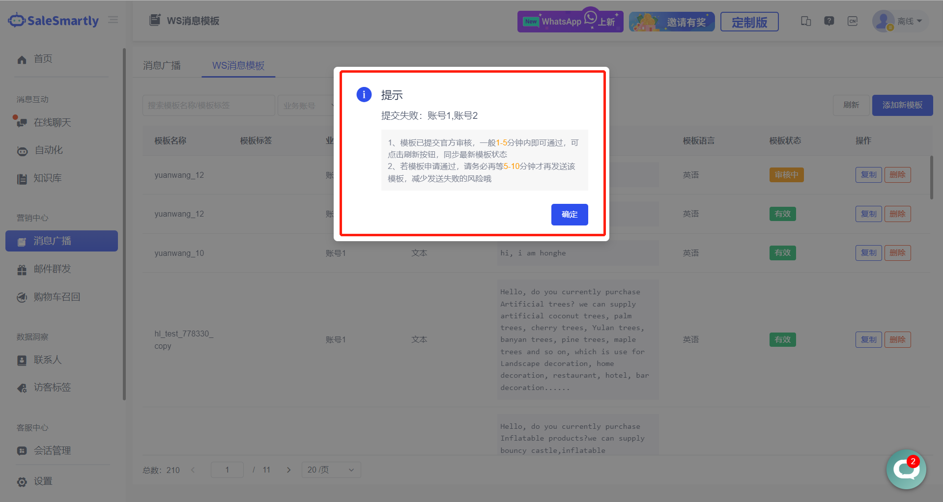 Trong Tin nhắn quảng bá - Mẫu tin nhắn WS, sau khi đăng ký mẫu WhatsApp, một cửa sổ bật lên sẽ hiển thị các tài khoản đã gửi thành công và không thành công, cũng như các lưu ý khi đăng ký mẫu.