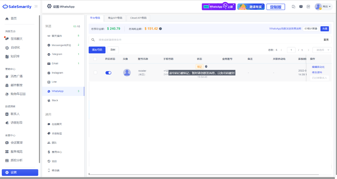 Kịch bản sử dụng: Với chức năng này, các thương nhân có thể cập nhật thông tin trạng thái tài khoản kịp thời. Khi một tài khoản bị đánh dấu, các thương nhân có thể làm theo hướng dẫn để không gửi tin nhắn nhóm, từ đó giảm cơ hội số bị chặn. Khi một tài khoản bị chặn, các thương nhân có thể thay đổi tài khoản kịp thời để tiếp tục gửi tin nhắn nhóm.