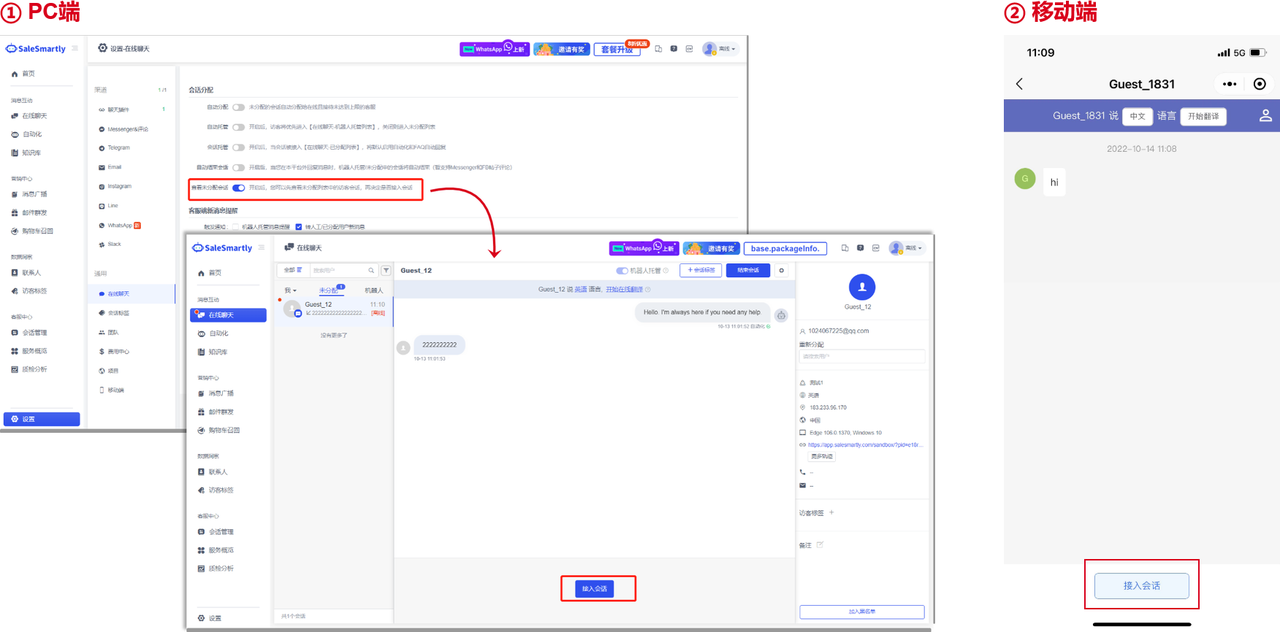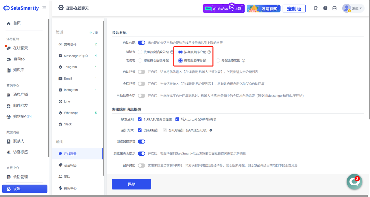 Kịch bản sử dụng: Với chức năng này, các thương nhân có thể phân bổ phiên làm việc cho các thành viên dịch vụ khách hàng theo thứ tự. Nhân viên dịch vụ khách hàng đang ngoại tuyến hoặc đã vượt quá giới hạn tiếp nhận sẽ không được phân bổ tự động, giúp các thương nhân sắp xếp hợp lý nhiệm vụ và khối lượng công việc của dịch vụ khách hàng.