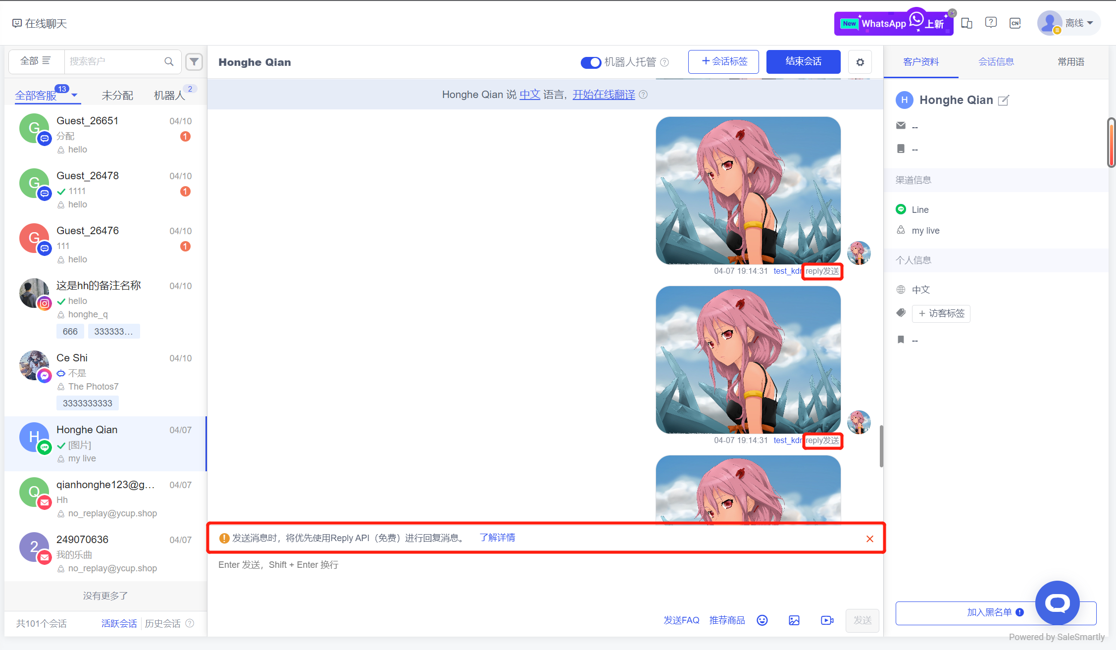 Mô-đun Trò chuyện trực tuyến nhắm vào các cuộc trò chuyện trên kênh Line và hỗ trợ gọi giao diện Trả lời chính thức để trả lời (trả lời miễn phí) trước.