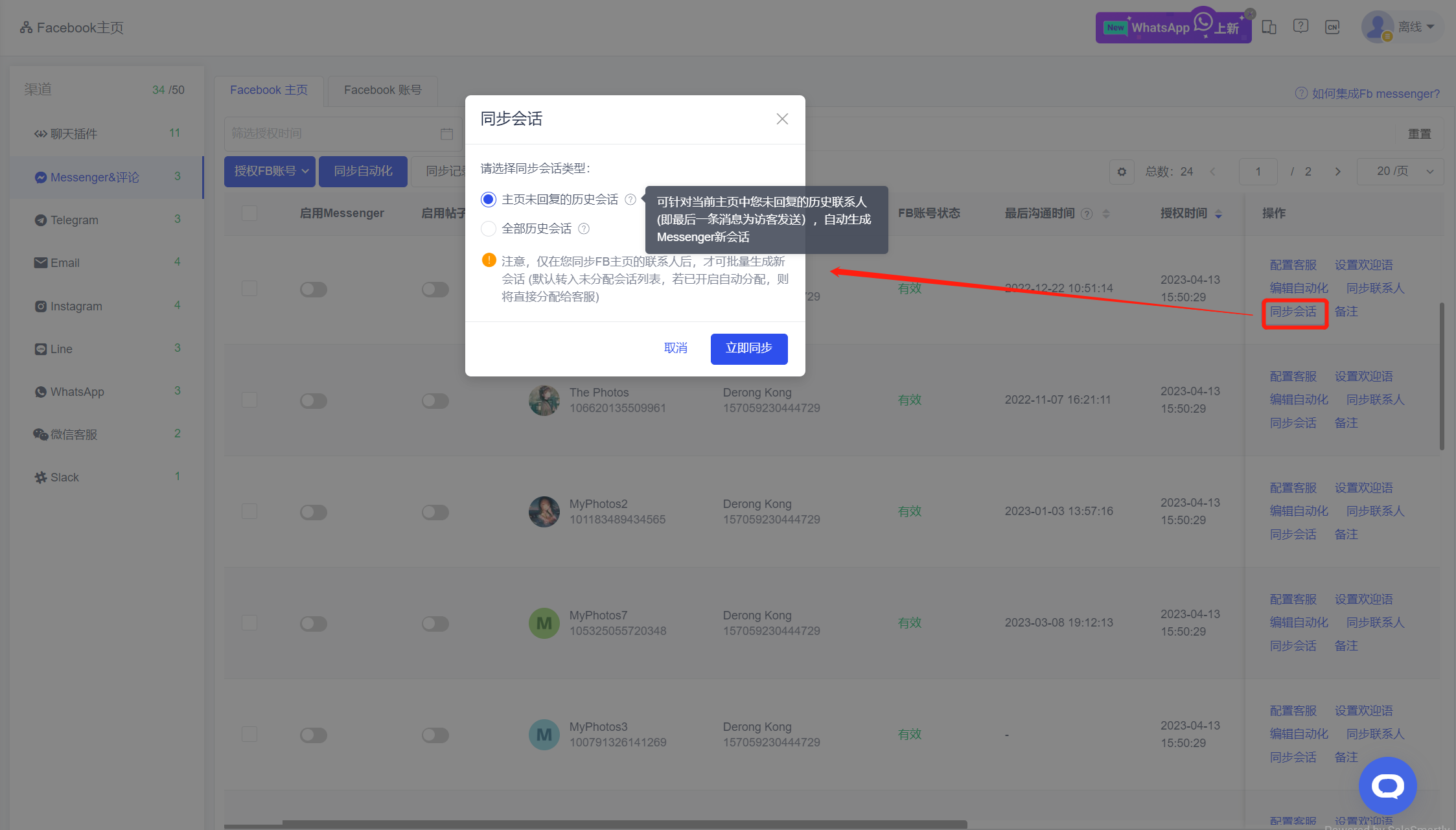 Tình huống sử dụng: Đối với người bán sử dụng SaleSmartly lần đầu, họ có thể đồng bộ các cuộc trò chuyện hiện có trên trang chủ FB vào nền tảng này để đạt được di chuyển liền mạch từ trang chủ FB.