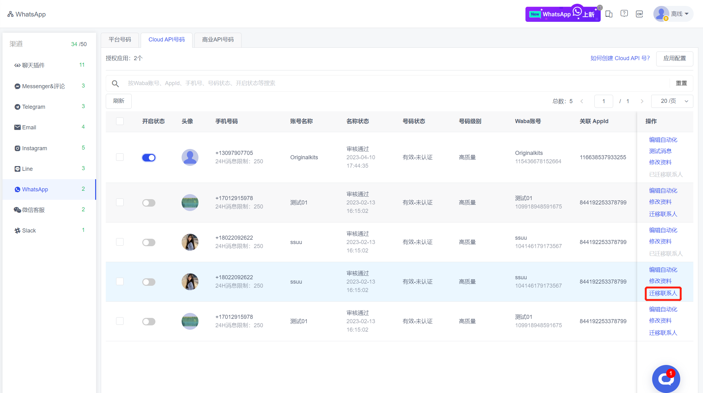 Trong danh sách Tích hợp kênh - WhatsApp, hỗ trợ di chuyển liên hệ cho số API đám mây và số doanh nghiệp.