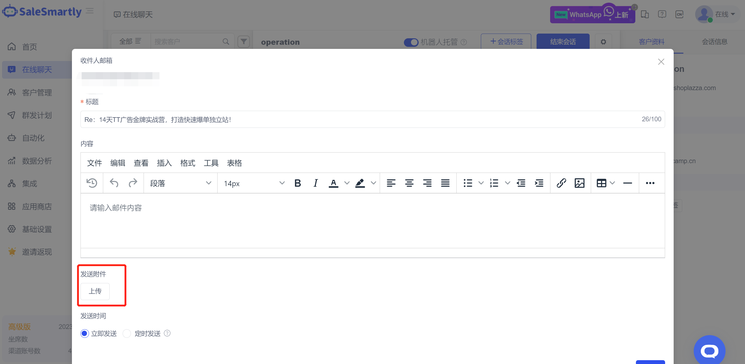 Trong kênh tin nhắn Email của Trò chuyện trực tuyến, bạn có thể tải lên tệp đính kèm khi gửi email.