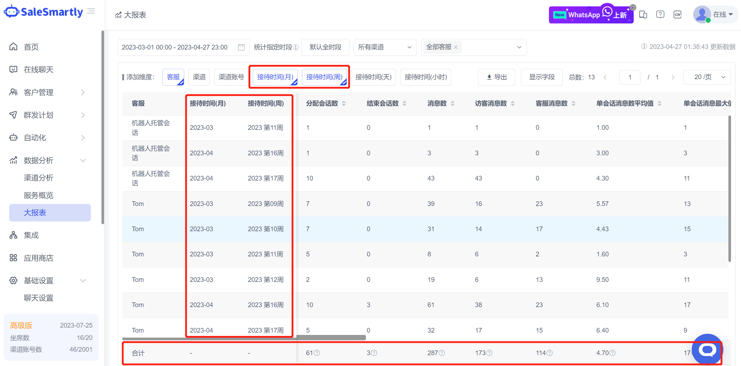 Tình huống sử dụng: Bằng cách xem dữ liệu theo chiều thời gian hàng tháng và hàng tuần, công ty có thể thực hiện phân tích tổng hợp dữ liệu định kỳ. Dữ liệu trong cột tổng có thể được sử dụng để so sánh trực quan hiệu suất của từng dịch vụ khách hàng và mức độ khác biệt với dữ liệu trung bình và tích lũy trong cột tổng.