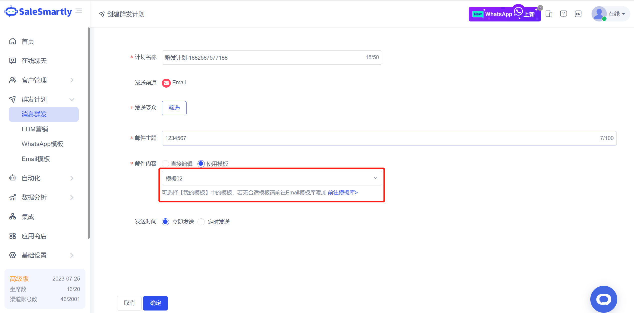 Trong kế hoạch kênh Email của Tin nhắn hàng loạt, nội dung email hỗ trợ gửi bằng mẫu.