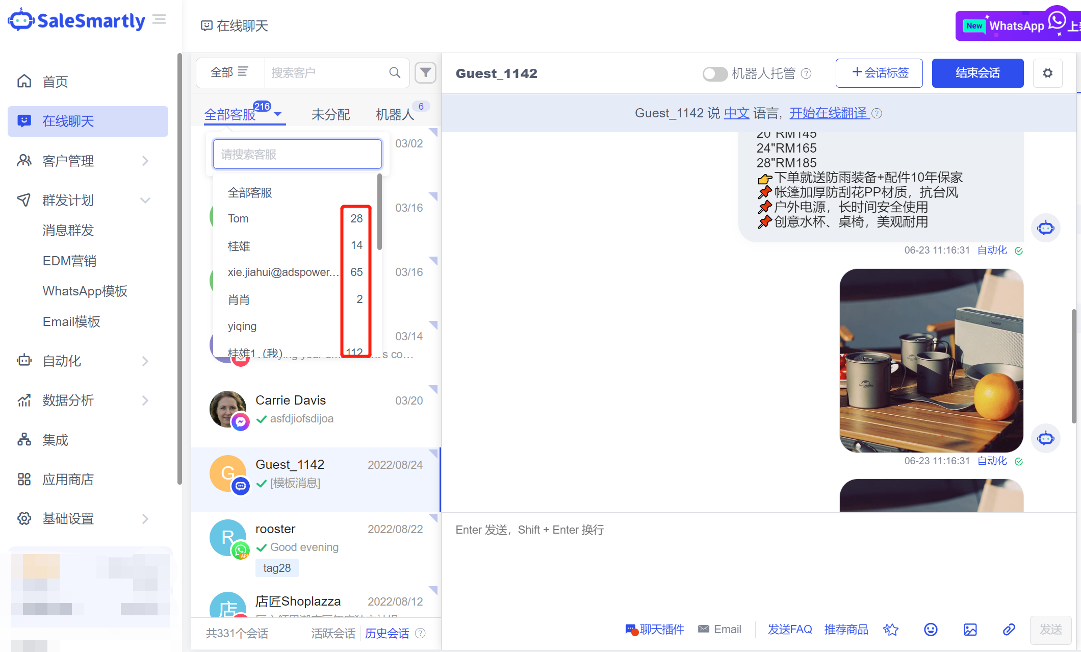 Tình huống sử dụng: Giám sát dịch vụ khách hàng có thể sử dụng bảng lọc này để hiểu trực quan trạng thái tiếp nhận/tải của từng dịch vụ khách hàng và phân phối lại phiên.