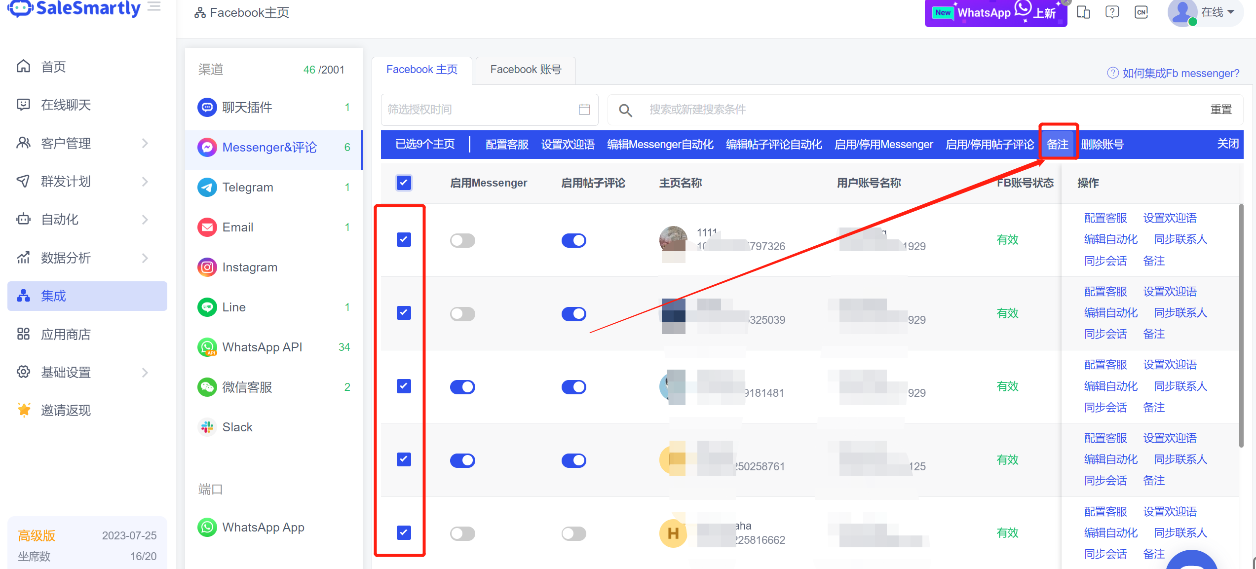 Trong danh sách Tích hợp - Messenger & Bình luận, sau khi chọn nhiều trang chủ, bạn có thể sửa đổi hàng loạt nội dung ghi chú của các trang chủ.