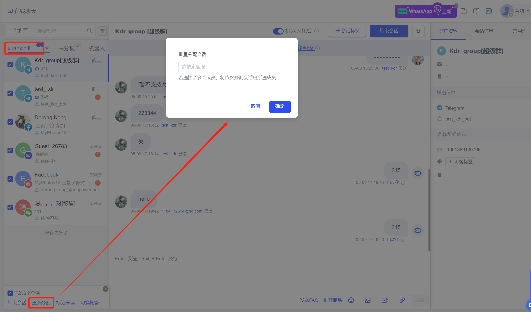Trong Trò chuyện trực tuyến Tab Đã chỉ định - Sau khi chọn nhân viên dịch vụ khách hàng tương ứng, các cuộc trò chuyện của dịch vụ khách hàng có thể được chỉ định hàng loạt cho nhân viên dịch vụ khách hàng khác; trong Tab Của tôi, bạn cũng có thể chỉ định hàng loạt các cuộc trò chuyện của mình cho nhân viên dịch vụ khách hàng khác.