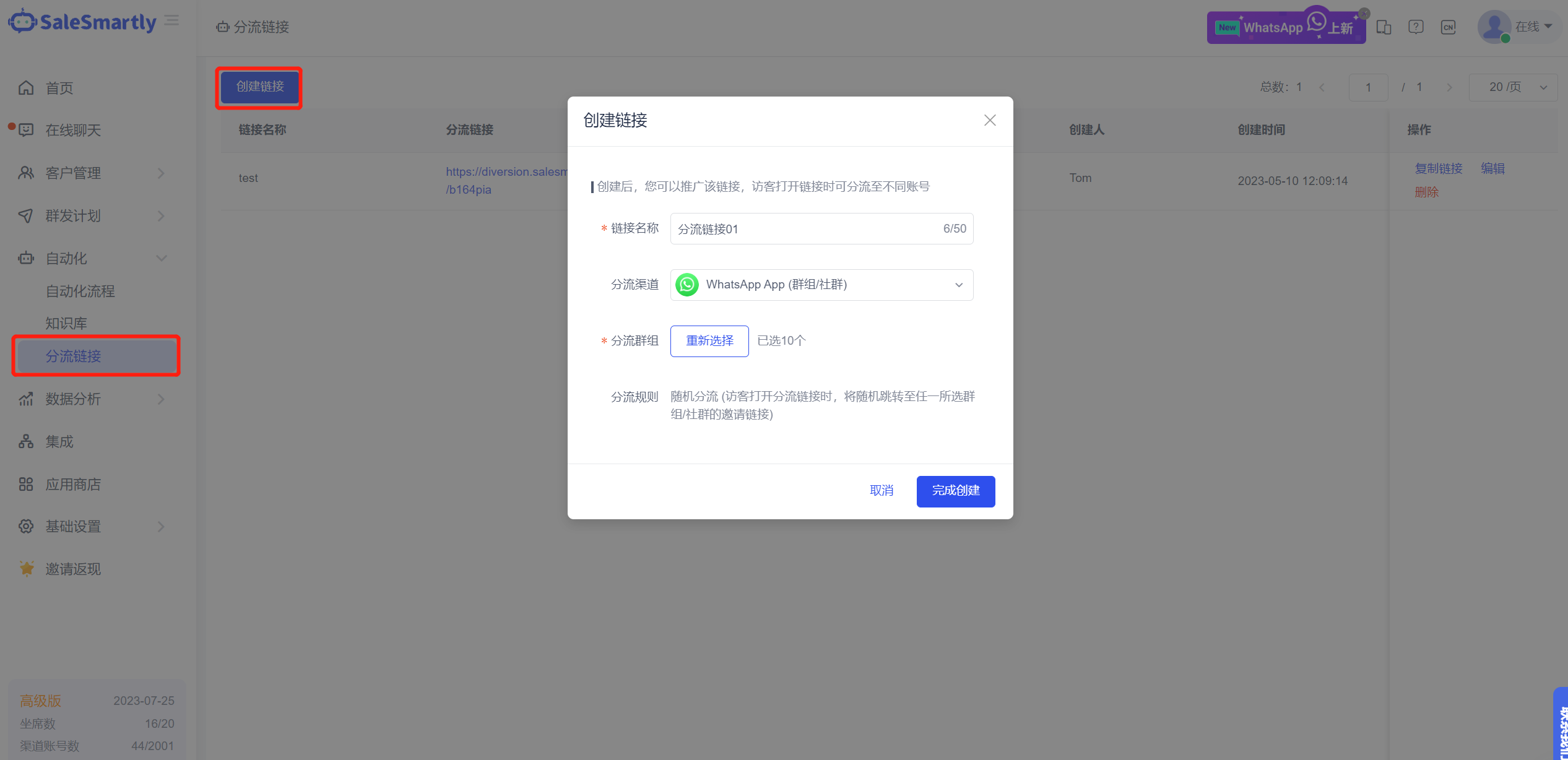 Trên trang Tự động - Liên kết chuyển hướng, bạn có thể tạo một liên kết chuyển hướng. Sau khi tạo, bạn có thể quảng bá liên kết. Khi khách mở liên kết, họ có thể được chuyển hướng đến các nhóm/cộng đồng WhatsApp APP khác nhau (bạn phải ủy quyền WhatsApp APP trước, và có thể liên hệ dịch vụ khách hàng để mở cổng).