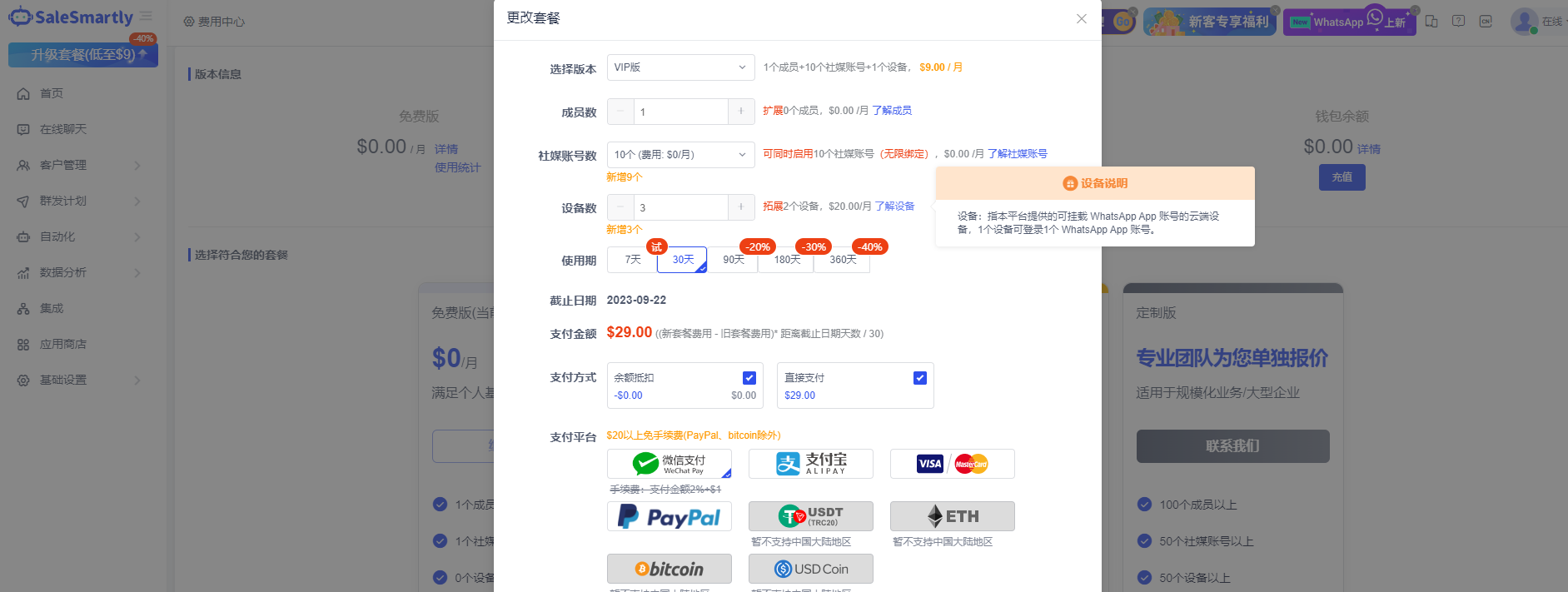 Khi nâng cấp hoặc thay đổi gói dịch vụ trong Basic Settings - Cost Center, bạn có thể tự nhập số lượng thiết bị mở rộng WhatsApp App muốn mua.