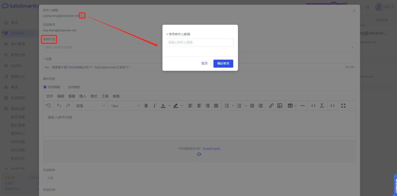 Trong phần Online Chat, đối với tin nhắn qua kênh email, bạn có thể sửa đổi địa chỉ email người nhận và thêm CC trong cửa sổ pop-up gửi email.