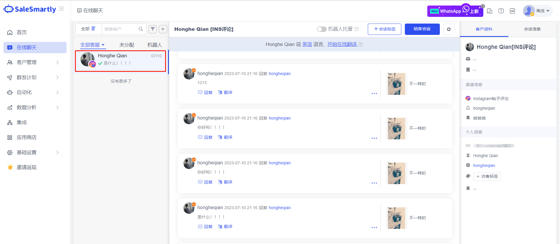 Tình huống sử dụng: Các thương hiệu vận hành bài đăng/stories/REELS trên Instagram hoặc đặt quảng cáo bài đăng có thể gửi và nhận tin nhắn bình luận Instagram trên nền tảng SaleSmartly, giúp bạn duy trì dư luận tích cực trong khu vực bình luận, loại bỏ đánh giá tiêu cực, giữ lại đánh giá tích cực và tương tác với người dùng theo cách tích cực, góp phần tăng tỷ lệ chuyển đổi đơn hàng.
