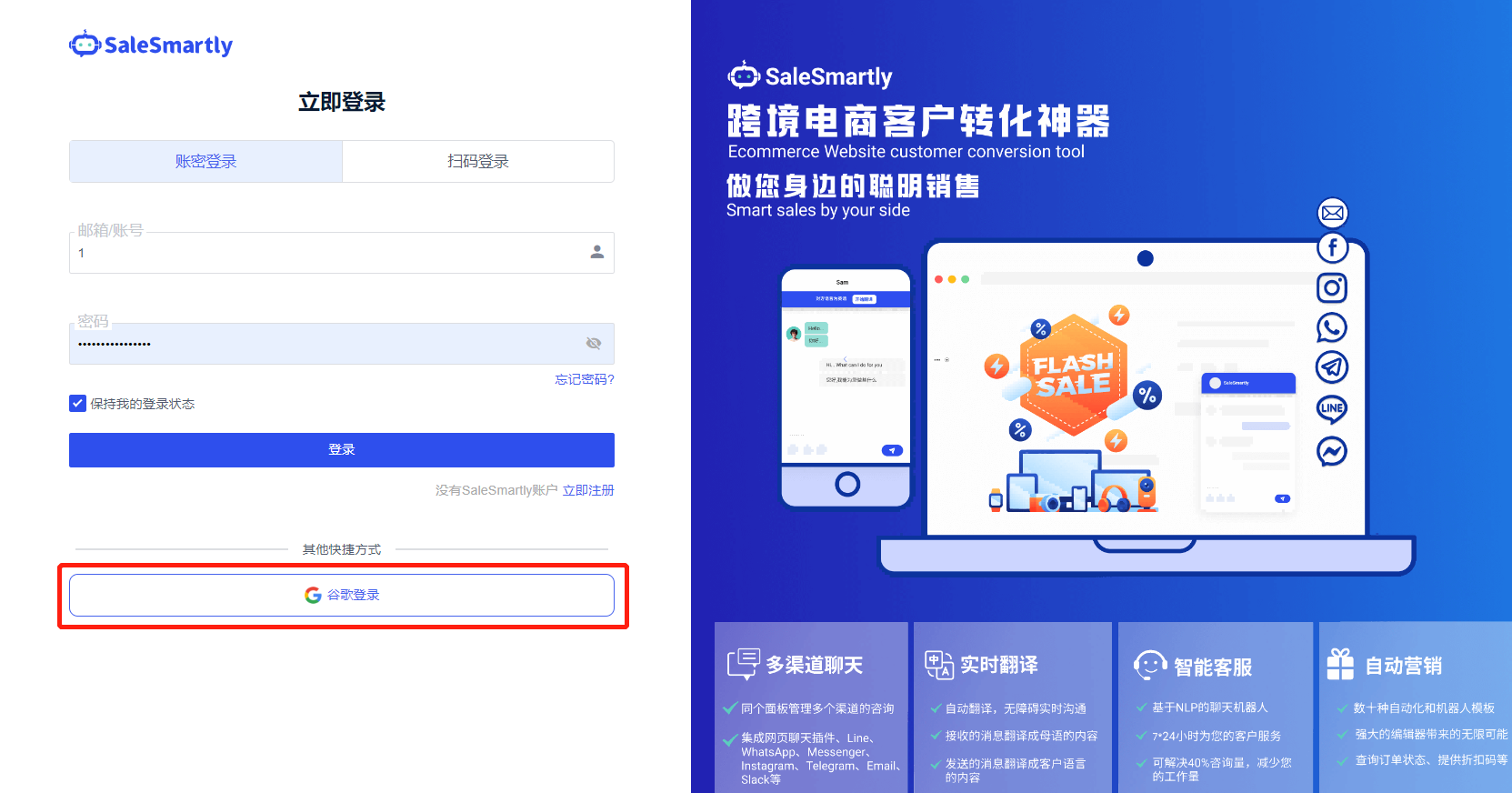Tình huống sử dụng: Nếu bạn có tài khoản Gmail, bạn có thể hoàn tất quá trình đăng ký/đăng nhập chỉ với một lần nhấp, giảm thiểu rào cản để bạn trải nghiệm SaleSmartly.