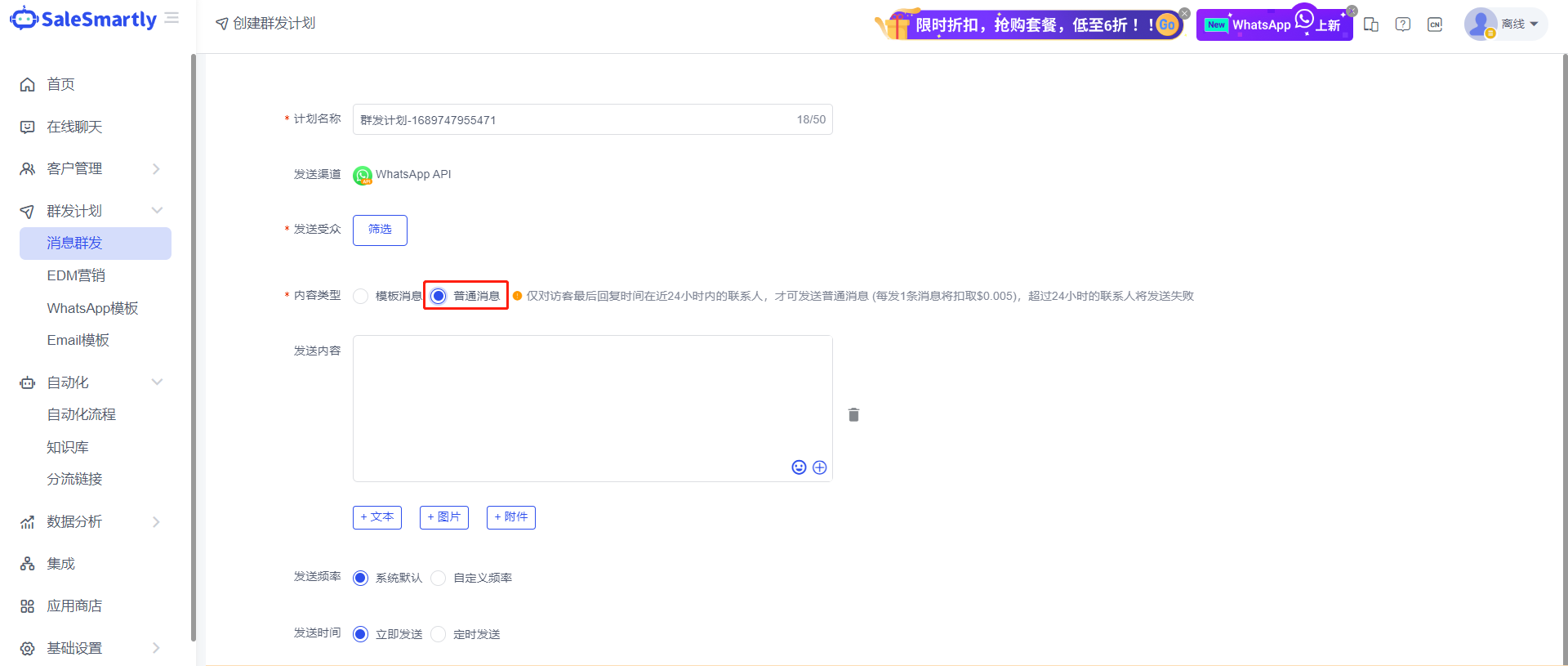 Trong giao diện Mass Message để tạo kế hoạch nhắn tin hàng loạt, số WhatsApp API hỗ trợ gửi tin nhắn không phải mẫu đến khách truy cập đã tương tác với bạn trong vòng 24 giờ.