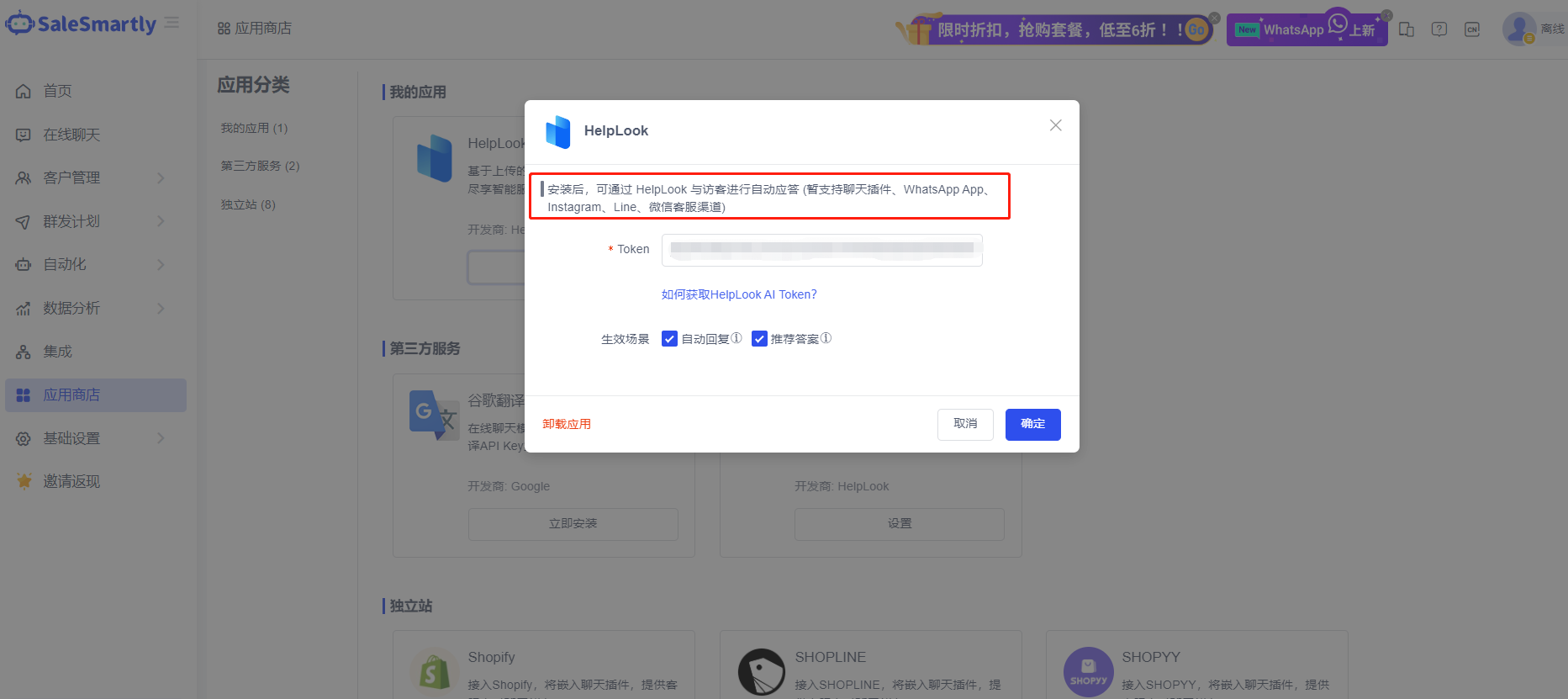 Tình huống sử dụng: Bạn có thể sử dụng khả năng trả lời thông minh HelpLook (ChatGPT3.5) để kích hoạt tư vấn tự phục vụ cho khách truy cập trong chat plugin, WhatsApp App, Instagram, Line, WeChat dịch vụ khách hàng và các kênh khác.