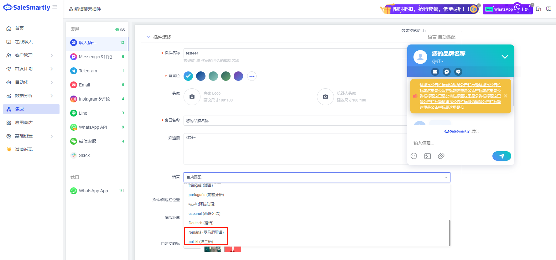 Trong giao diện chỉnh sửa Integration-Chat Plugin, văn bản mặc định trong cửa sổ trò chuyện trực tuyến hỗ trợ nhiều ngôn ngữ như tiếng Romania và tiếng Ba Lan.