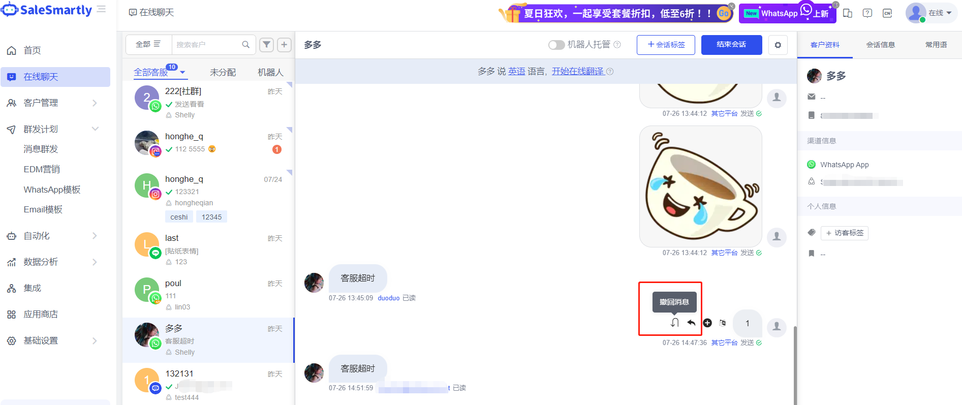Một chức năng mới thu hồi tin nhắn đã được thêm vào giao diện trò chuyện kênh WhatsApp App trong Online Chat.