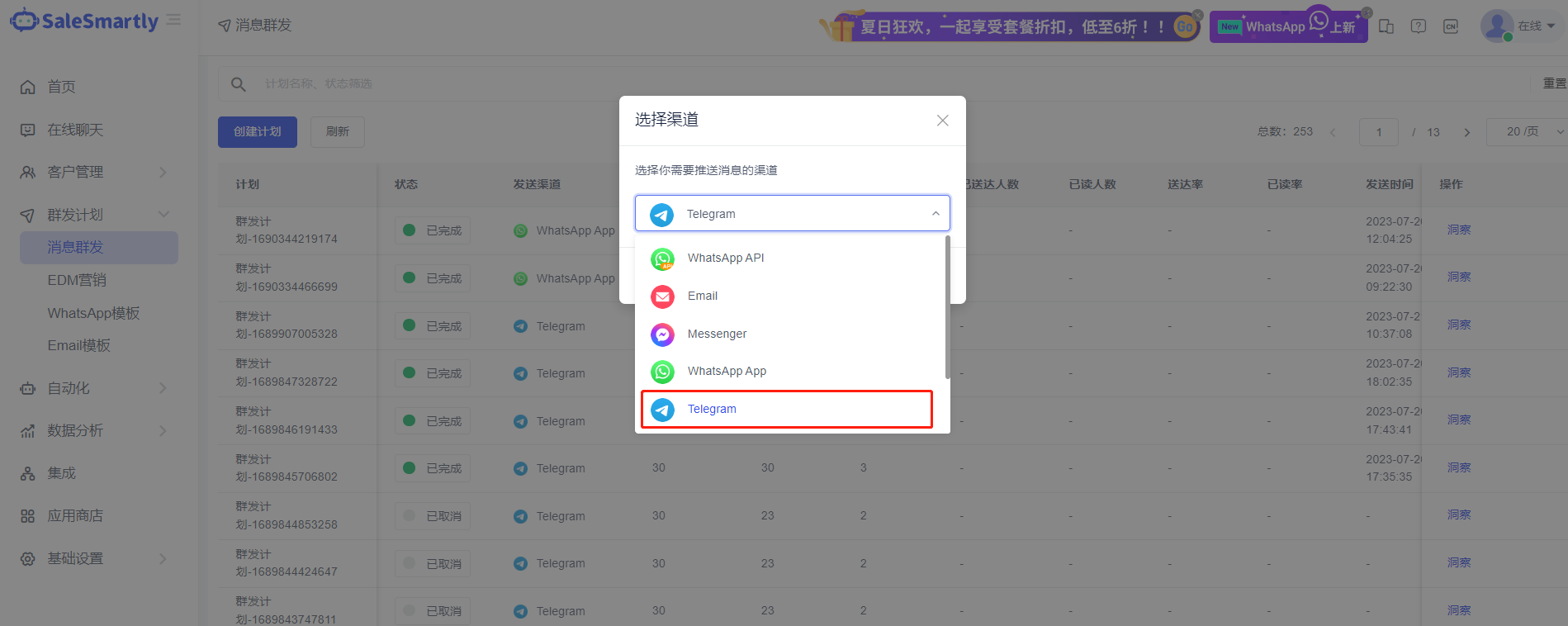 Trong giao diện Mass Message Plan - Create Plan, hỗ trợ nhắn tin nhóm qua kênh Telegran.