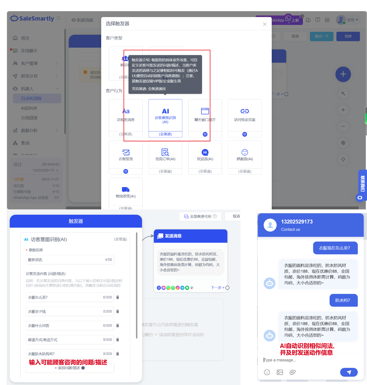 Trong Robot - Quy trình Tự động, một trình kích hoạt nhận diện ý định khách hàng bằng AI mới đã được thêm vào. Bạn có thể nhập trước thông tin mà khách hàng có thể gửi. Trong cuộc trò chuyện thực tế, nếu khách hàng gửi một tin nhắn tương tự, nó sẽ tự động được nhận diện bởi mô hình AI và quy trình tự động tương ứng sẽ được kích hoạt.