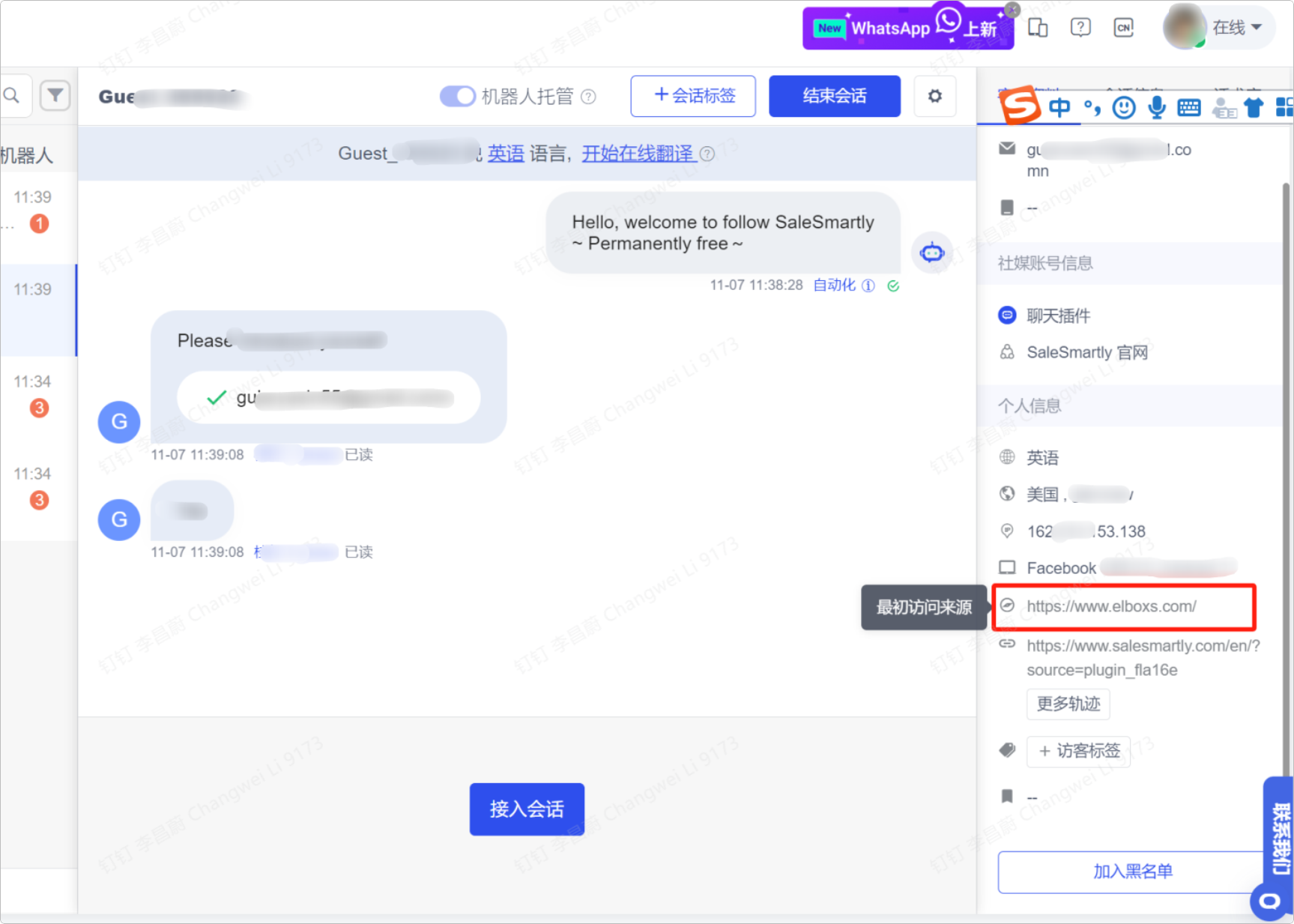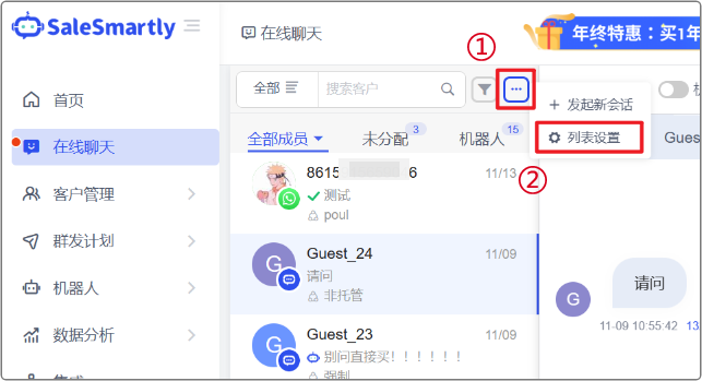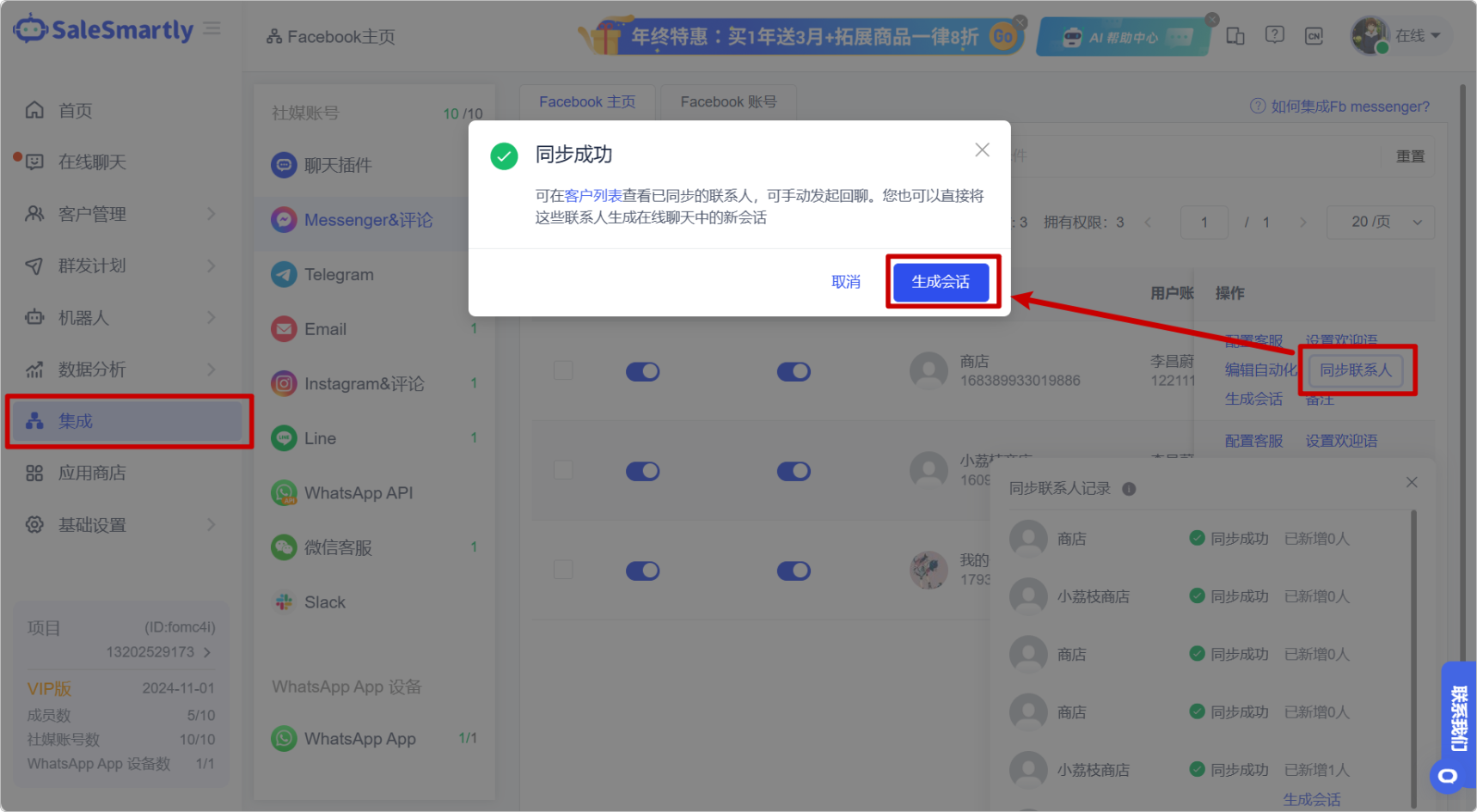 Trong Tích hợp, chúng tôi đã tối ưu hóa các chức năng đồng bộ liên hệ và tạo cuộc trò chuyện, cho phép bạn đồng bộ liên hệ lịch sử trên trang công khai Facebook của bạn đến nền tảng SaleSmartly và nhanh chóng bắt đầu trò chuyện.