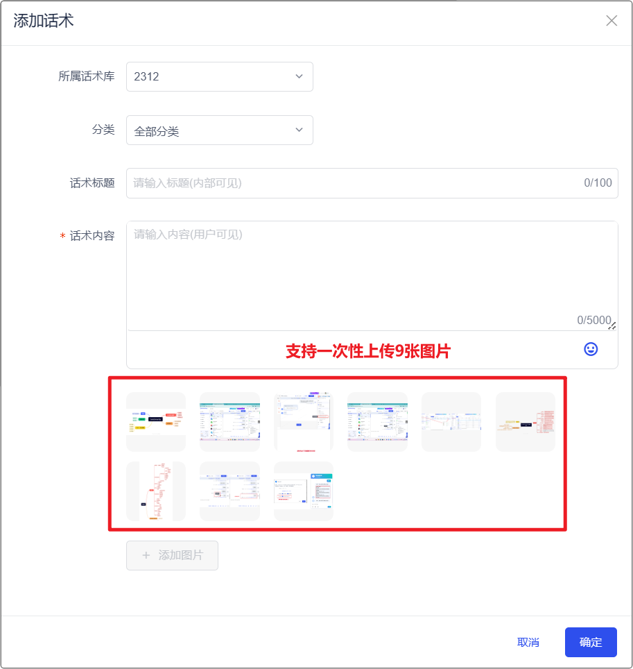 Trong thư viện lời nói/ngữ liệu AI, bạn có thể thêm tối đa 9 hình ảnh khi thêm FAQ/lời nói.