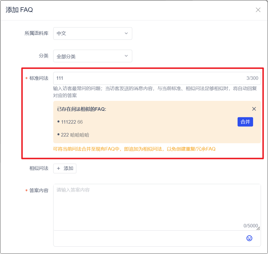 Khi bạn thêm câu hỏi FAQ trong Robot-Ngữ liệu AI, nó có thể tự động đề xuất các FAQ hiện có có độ tương đồng cao với nội dung câu hỏi tiêu chuẩn bạn nhập, giúp bạn hợp nhất các câu hỏi.