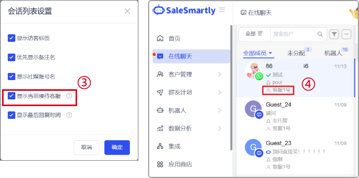 Trong Trò chuyện Trực tuyến-Tab Tất cả Thành viên, thông tin thành viên tiếp nhận mới đã được thêm vào. Sau khi kiểm tra cài đặt, biệt danh của nhân viên dịch vụ khách hàng tiếp nhận phiên hiện tại có thể được hiển thị.
