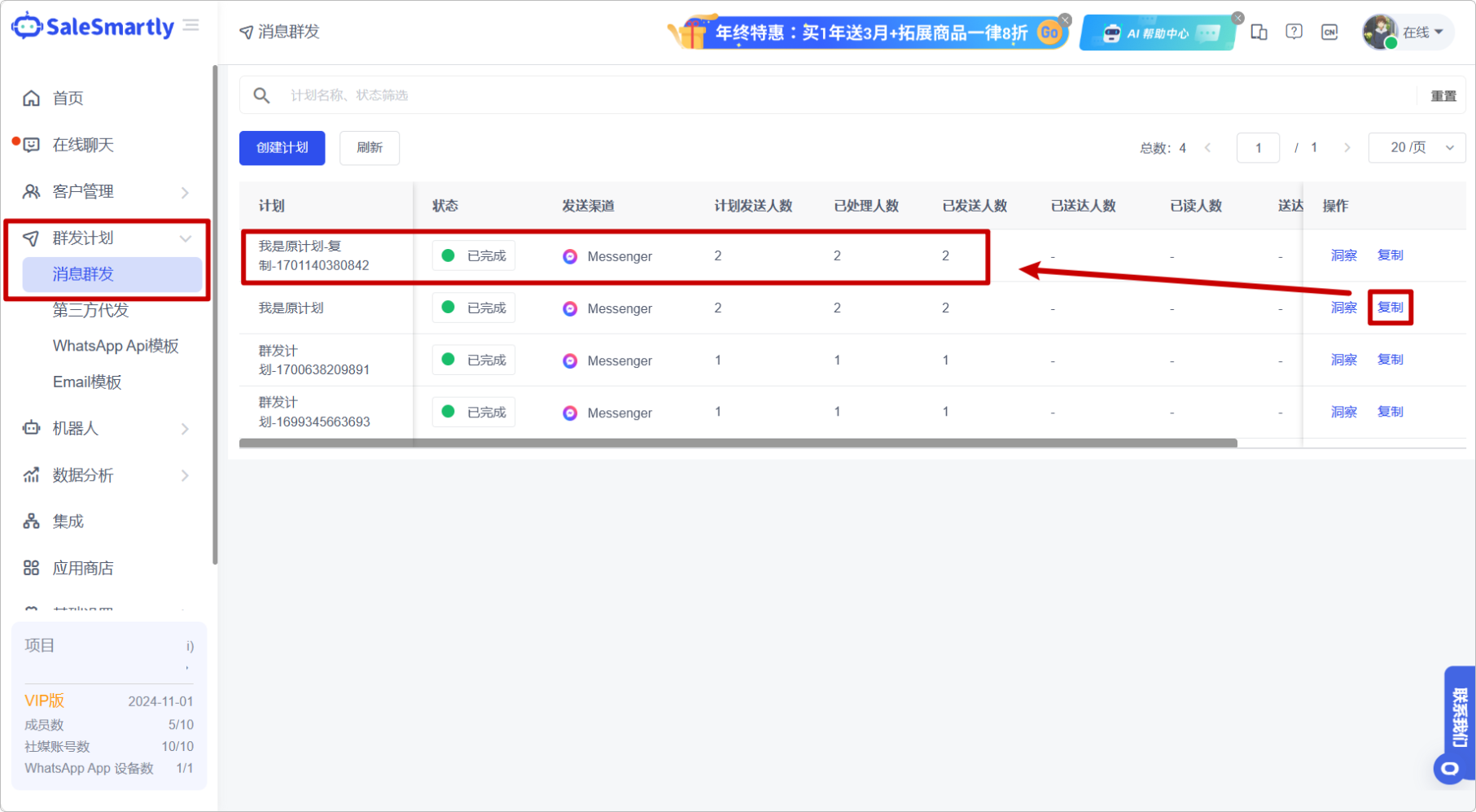Tình huống sử dụng: Bạn không cần phải tạo các kế hoạch tin nhắn hàng loạt tương tự nhiều lần. Chức năng sao chép có thể tiết kiệm rất nhiều thời gian và công sức.