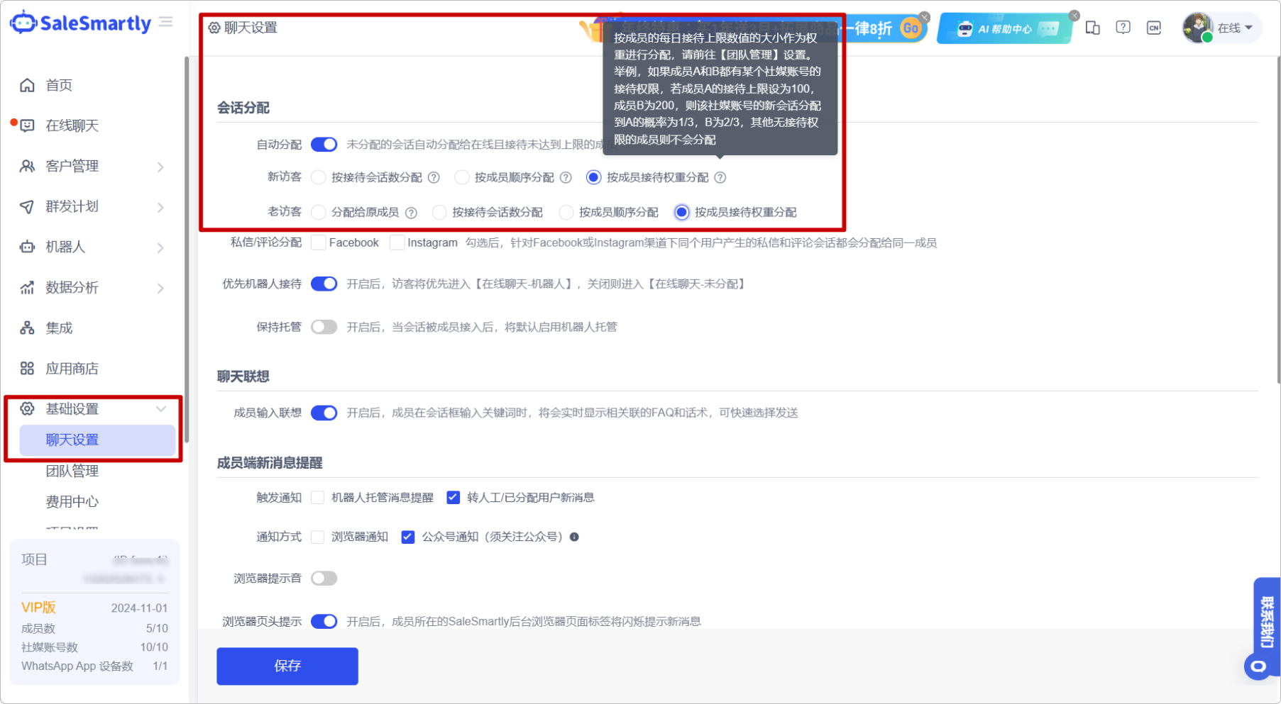 Trong Cài đặt Cơ bản - Cài đặt Trò chuyện, chức năng phân bổ tự động hiện hỗ trợ quy tắc phân bổ dựa trên trọng số tiếp nhận thành viên, tức là trọng số phân bổ được xác định bởi tỷ lệ số lần tiếp nhận của thành viên trên tổng số lần tiếp nhận. Tỷ lệ càng lớn, xác suất phân bổ cuộc trò chuyện càng cao.