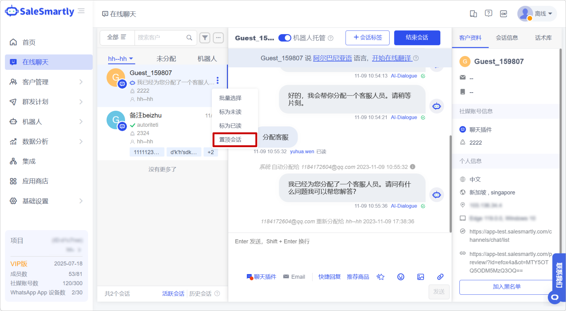 Tình huống sử dụng: Khi bạn là quản trị viên xem hồ sơ trò chuyện của người khác, bạn có thể trực tiếp ghim các cuộc trò chuyện quan trọng dưới tên dịch vụ khách hàng để nhắc nhở thành viên chú ý đến các cuộc trò chuyện tương ứng.