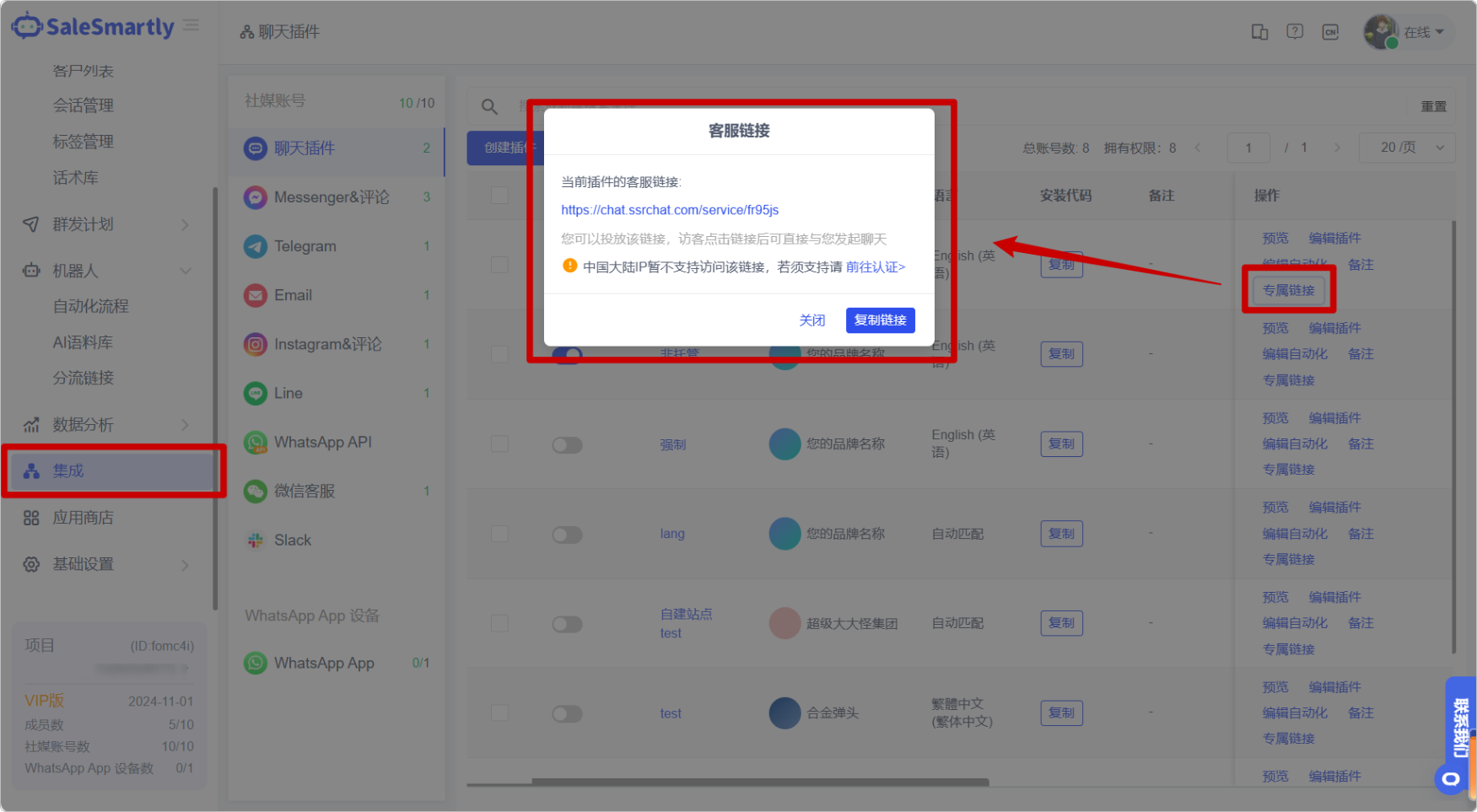 Trong Tích hợp - Plugin Trò chuyện, chỉ các dự án đã mua Phiên bản Doanh nghiệp (ít nhất 30 ngày) mới có thể nhận được liên kết trò chuyện độc quyền của plugin trò chuyện.