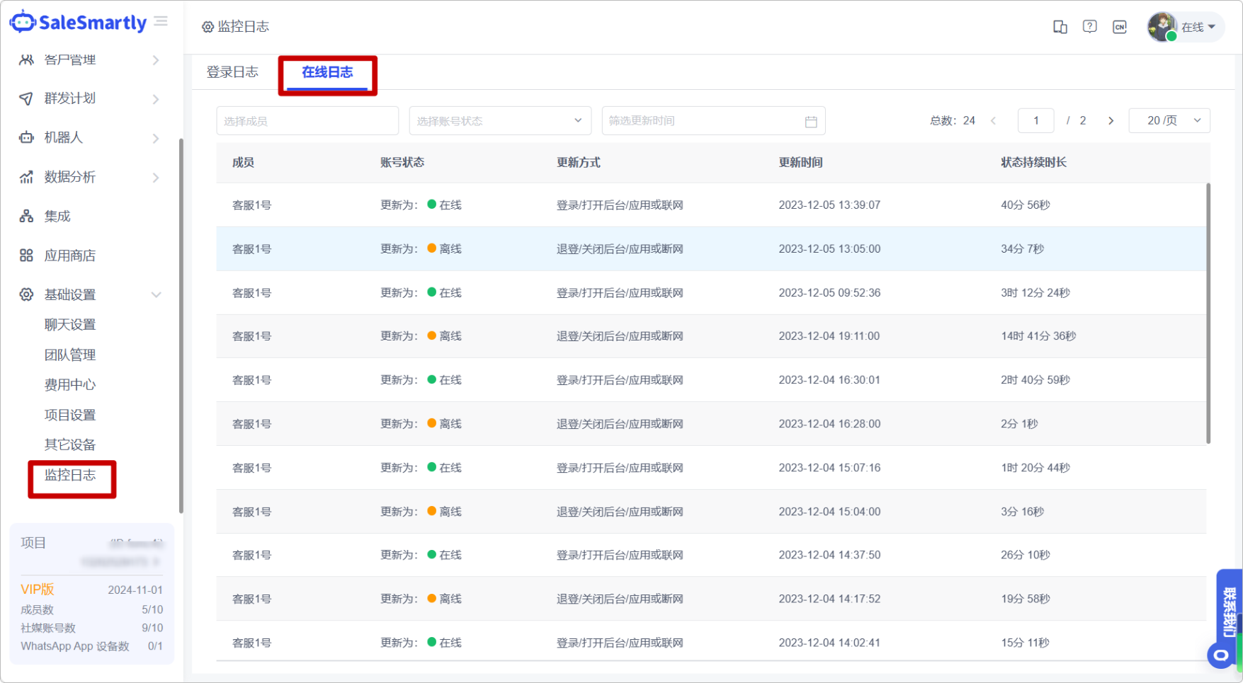 Trong Cài đặt Cơ bản - Nhật ký Giám sát, một danh sách nhật ký trực tuyến mới đã được thêm vào, nơi bạn có thể xem thông tin chi tiết như trạng thái tài khoản của mỗi thành viên (trực tuyến/ngoại tuyến/bận), thời gian cập nhật trạng thái và thời lượng trạng thái.