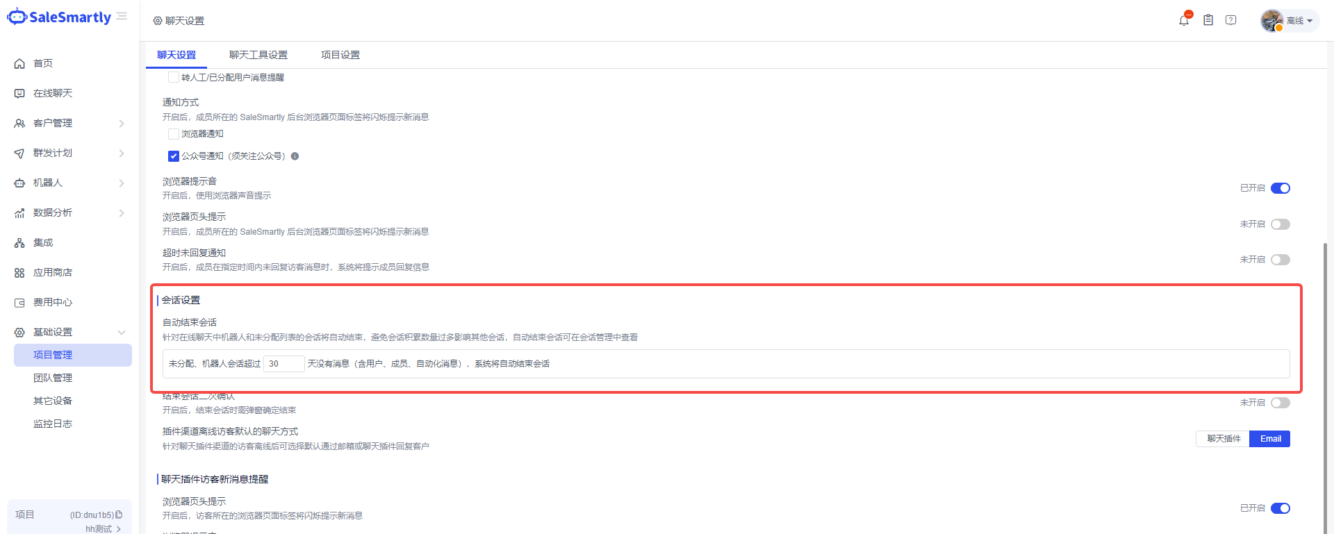 Thêm cài đặt mới tự động kết thúc phiên trong Cài đặt cơ bản - Cài đặt trò chuyện quản lý dự án, hỗ trợ tùy chỉnh thời gian.