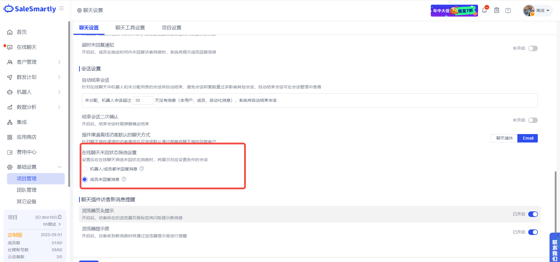 Trong Cài đặt cơ bản - Cài đặt trò chuyện quản lý dự án, bạn có thể cá nhân hóa thành viên và robot dựa trên phạm vi lọc tin nhắn chưa trả lời trong trò chuyện trực tuyến.
