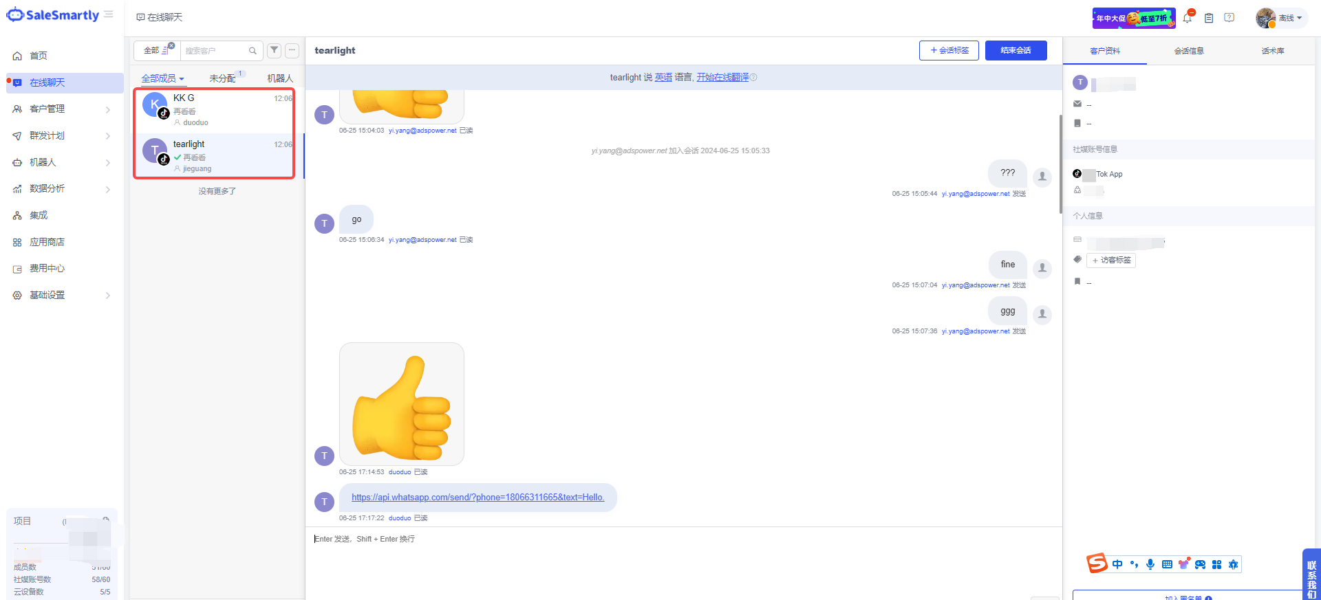 Tình huống sử dụng: Bạn có thể sử dụng tài khoản cá nhân Tiktok để nhận và trả lời tin nhắn từ bạn bè. Kết hợp với tính năng gửi tin nhắn hàng loạt, dịch, gắn nhãn và các công cụ cá nhân hóa khác của SaleSmartly, có thể giúp bạn đạt được marketing chính xác và tiếp cận nhiều kịch bản kinh doanh hơn.