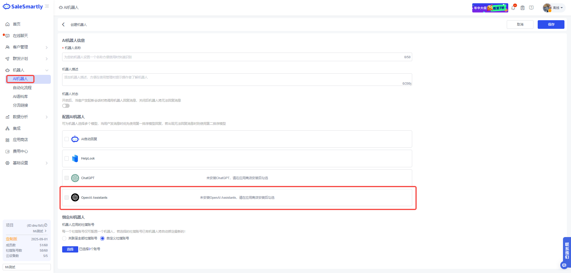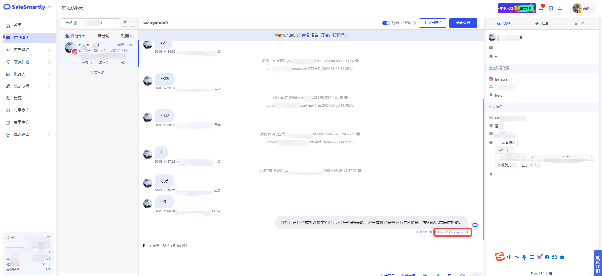 Tình huống sử dụng: Sau khi cài đặt OpenAI Assistants, bạn có thể gọi OpenAI Assistants trong robot AI của mình. Các robot trên nền tảng salesmartly hỗ trợ kết nối với các tài khoản mạng xã hội khác nhau. Sau khi cấu hình và khởi động robot, nó sẽ trả lời tin nhắn khách hàng bằng cách gọi OpenAI Assistants.