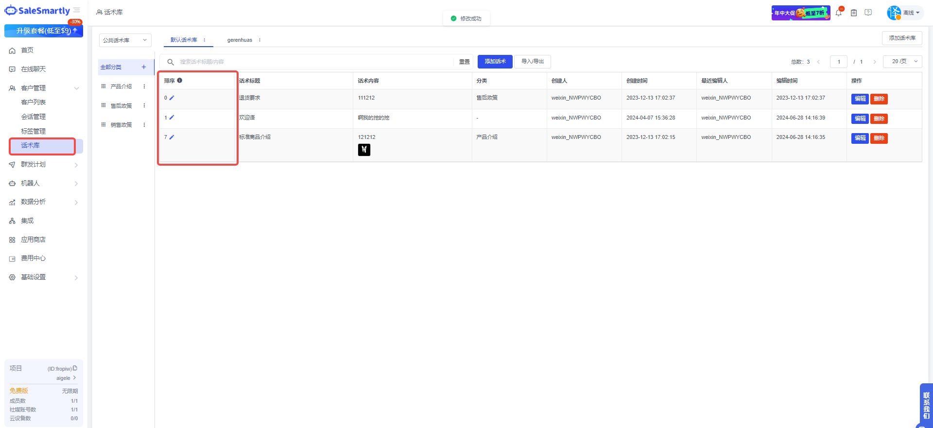 Trong Quản lý khách hàng - Thư viện kịch bản, bạn có thể kéo các danh mục kịch bản để thiết lập thứ tự sắp xếp và đặt thứ tự sắp xếp cho các kịch bản.