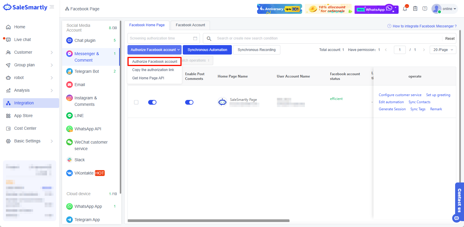 Sau khi ủy quyền và đăng nhập, bạn có thể tìm thấy tài khoản của mình trong Tích hợp-Messenger&Bình luận-Trang chủ Tài khoản Facebook, bật Messenger và đăng bình luận, và bạn có thể bắt đầu trò chuyện.