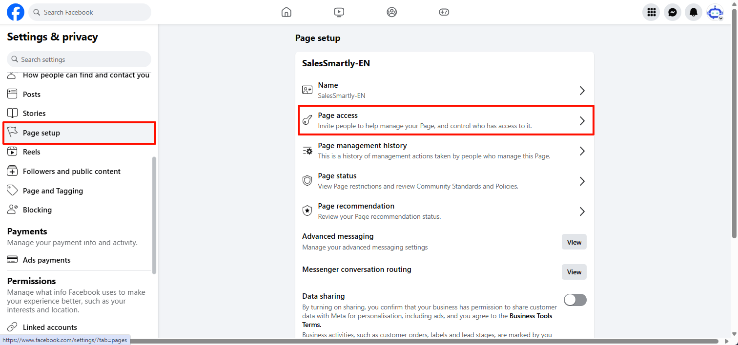- Nhấp vào Thiết lập Công khai, sau đó nhấp vào Quyền truy cập Trang.
