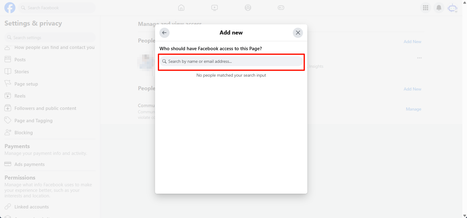 - Nhấp vào Tiếp theo, nhập tên hoặc địa chỉ email của người dùng bạn muốn cấp quyền quản lý Facebook, sau đó nhấp vào tên người dùng.