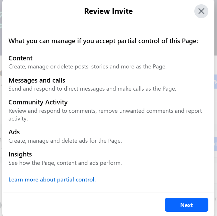 Khi người được mời chấp nhận lời mời và kiểm tra quyền, họ sẽ thấy "Chấp nhận Kiểm soát Một phần Trang này"