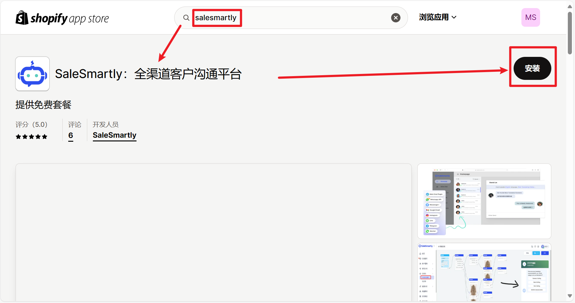 - Sau khi đăng nhập vào Shopify, truy cập mục Apps > chọn Add App > nhấp vào Shopify App Store > tìm kiếm SaleSmartly và bấm Install để vào trang hướng dẫn ủy quyền.