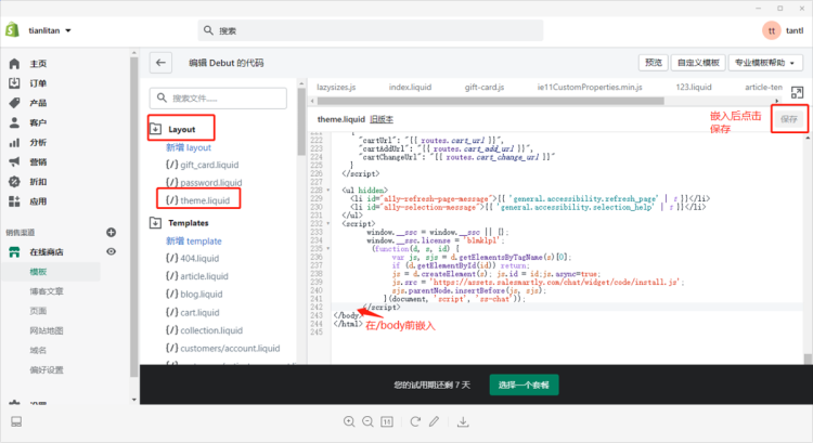 - Trong trình chỉnh sửa, tìm file layout-theme.liquid, dán mã JavaScript vào phần đầu code và nhấn Save để hoàn tất cài đặt.