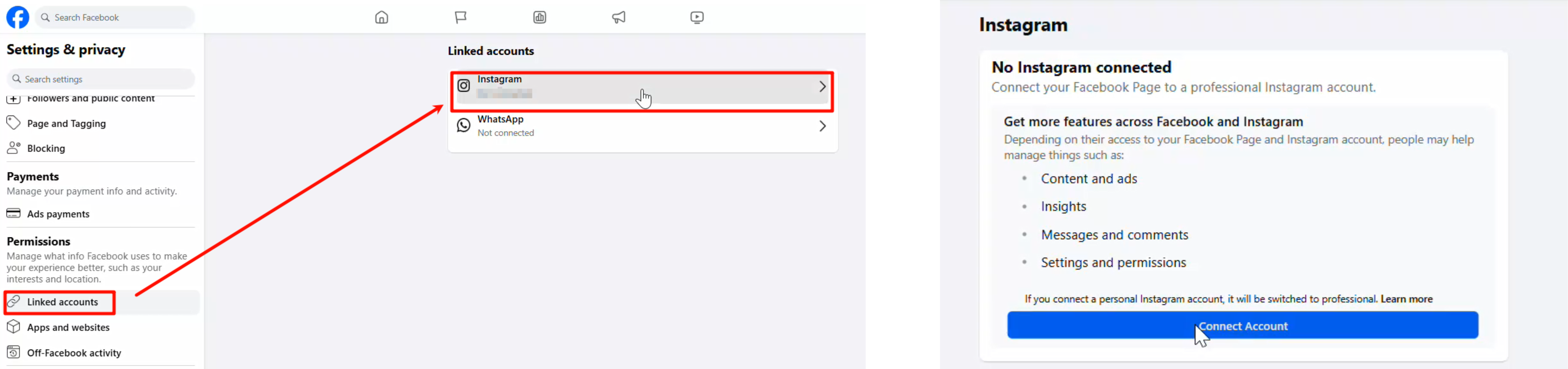 Truy cập Trang Facebook công khai, chọn Cài đặt - Cài đặt & Quyền riêng tư - Tài khoản được Liên kết - Instagram