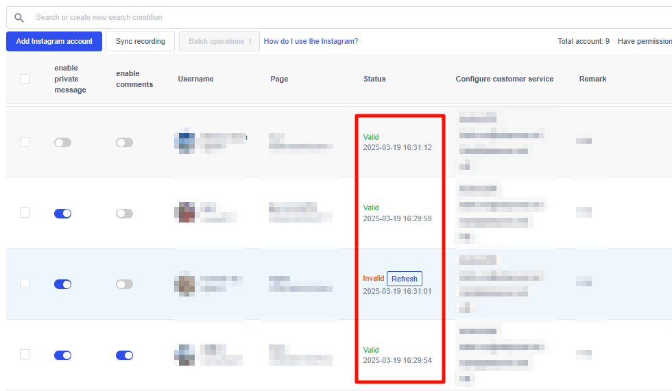 Quay lại bảng điều khiển SaleSmartly. Tải lại trang đến khi tài khoản Instagram xuất hiện. Nhấn Bật Tin nhắn Riêng tư hoặc Bật Bình luận để bắt đầu quản lý hội thoại.
