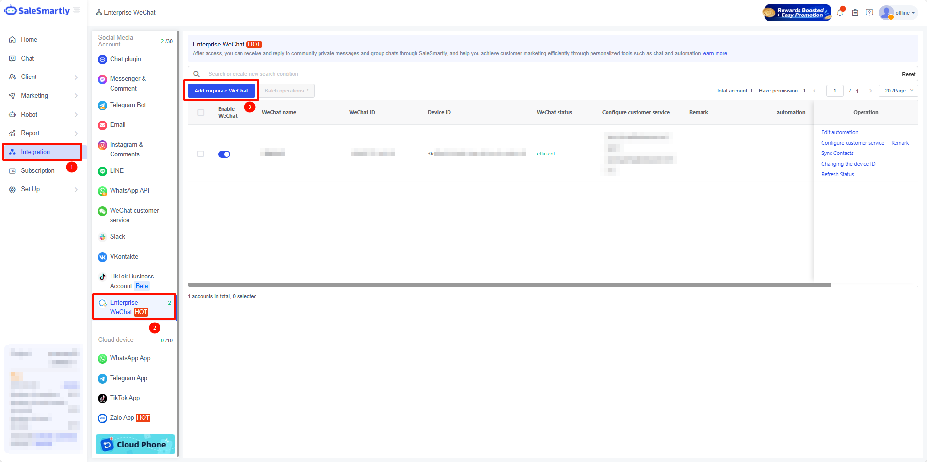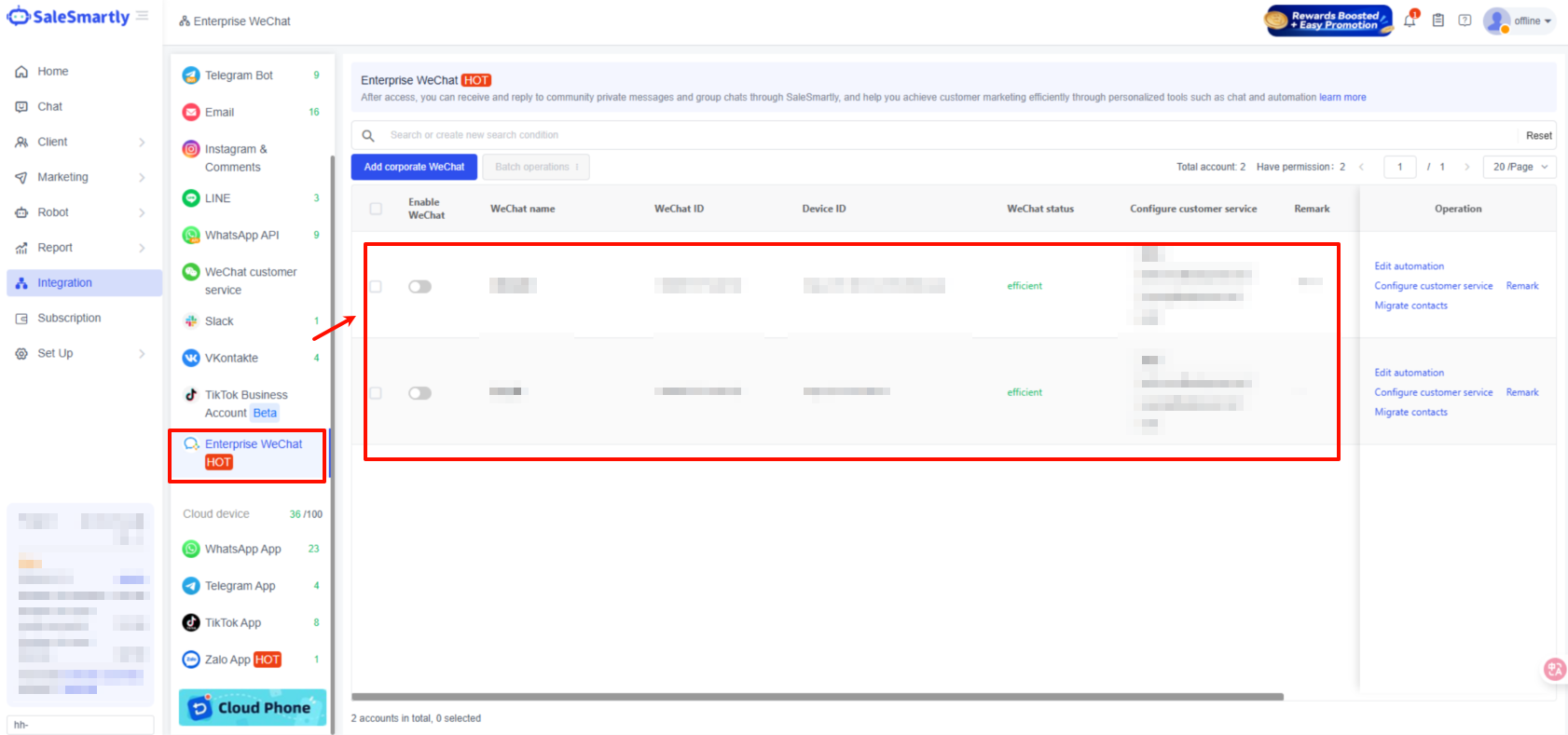 Việc tích hợp tài khoản WeCom (Enterprise WeChat) của bạn với SaleSmartly cho phép bạn quản lý nhiều tài khoản WeCom từ một nền tảng duy nhất. Đội ngũ của bạn có thể xử lý tin nhắn khách hàng từ nhiều tài khoản WeChat khác nhau mà không cần chuyển đổi giữa các nền tảng, từ đó nâng cao hiệu quả dịch vụ và cải thiện khả năng hợp tác trong đội ngũ.