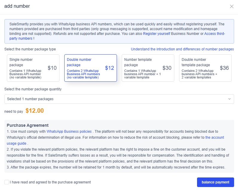 Nhấp vào Tích hợp - WhatsApp API, sau đó nhấp vào Thêm số để mở trang mua. Chọn loại và số lượng gói số bạn muốn mua trên trang, sau đó đồng ý với điều khoản để hoàn tất mua.