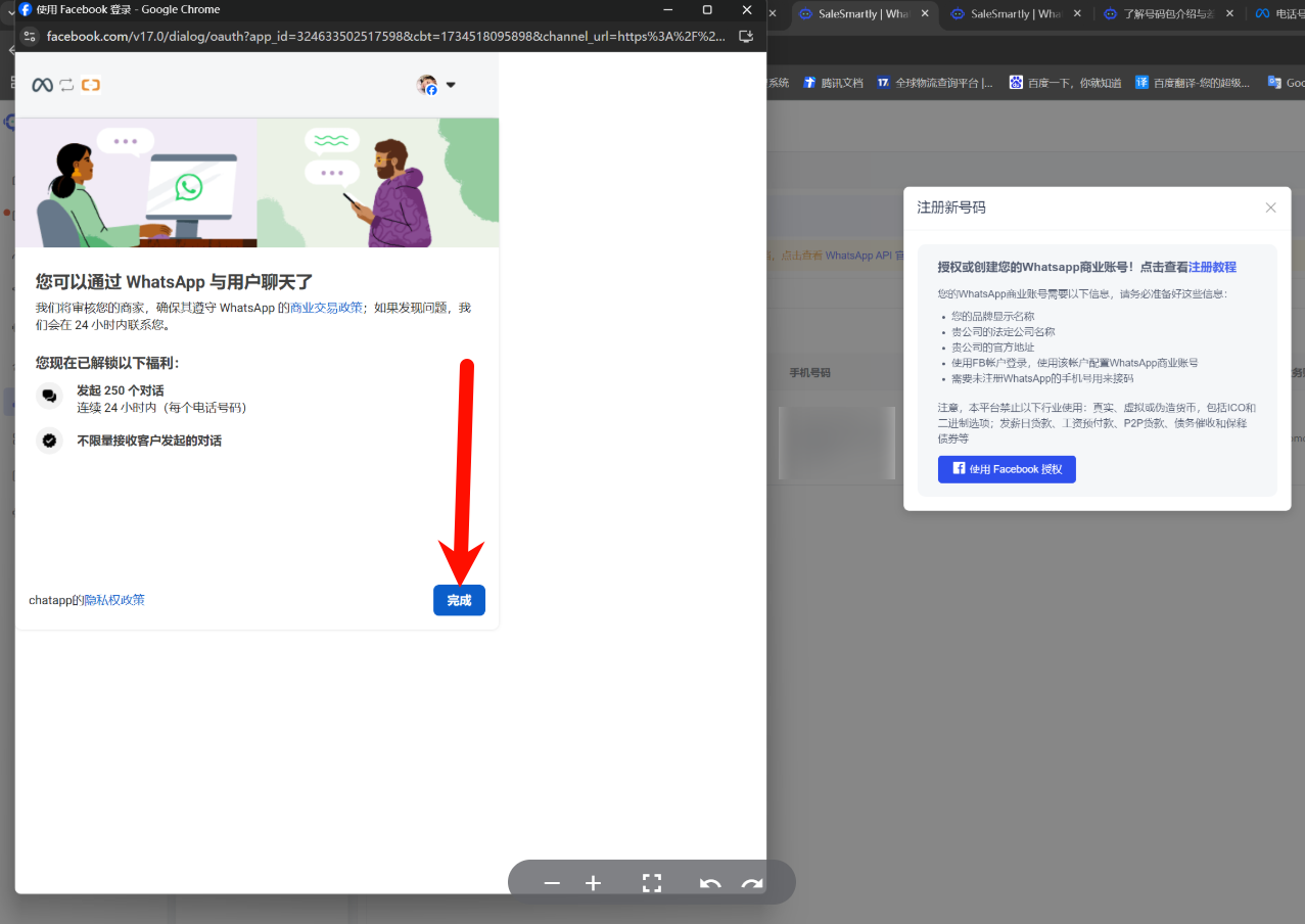 (2) Sau khi Facebook phê duyệt, số sẽ tự động đồng bộ trong hệ thống SaleSmartly. Nếu không đồng bộ, vui lòng lặp lại các bước đăng ký WhatsApp API số để đồng bộ vào hệ thống SaleSmartly. Chi tiết xem: Hướng dẫn tự đăng ký số WhatsApp API