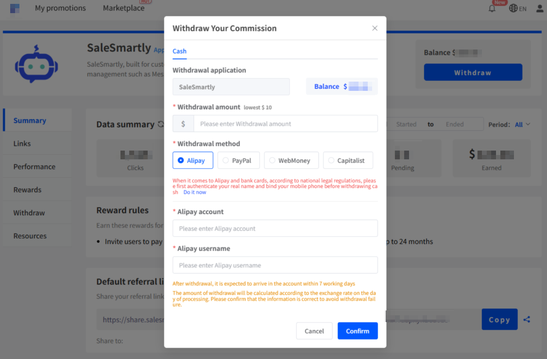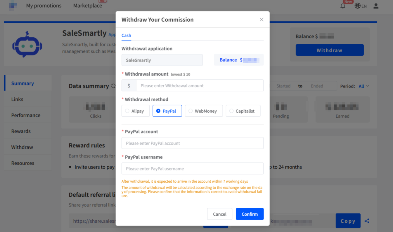 Rút về nền tảng thanh toán trong nước: Thu nhập cá nhân sẽ bị tính phí xử lý (để cung cấp dịch vụ tốt hơn cho giới thiệu viên, SaleSmartly sẽ chịu phí xử lý khi rút tiền khuyến mãi).